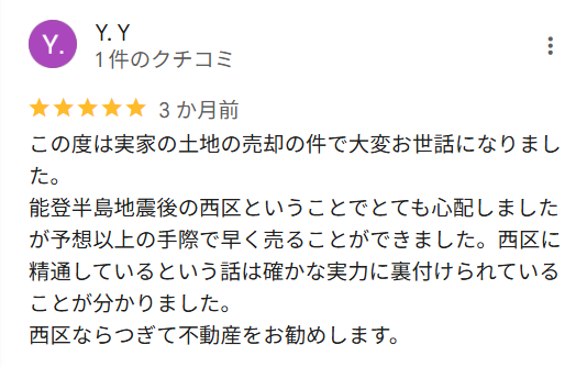 この度は実家の土地の売却の件で大変お世話になりました。 能登半島地震後の西区ということでとても心配しましたが予想以上の手際で早く売ることができました。西区に精通しているという話は確かな実力に裏付けられていることが分かりました。 西区ならつぎて不動産をお勧めします。