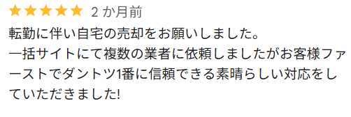 転勤に伴い自宅の売却をお願いしました。 一括サイトにて複数の業者に依頼しましたがお客様ファーストでダントツ1番に信頼できる素晴らしい対応をしていただきました!