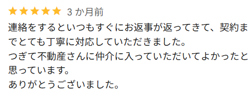 連絡をするといつもすぐにお返事が返ってきて、契約までとても丁寧に対応していただきました。 つぎて不動産さんに仲介に入っていただいてよかったと思っています。 ありがとうございました。