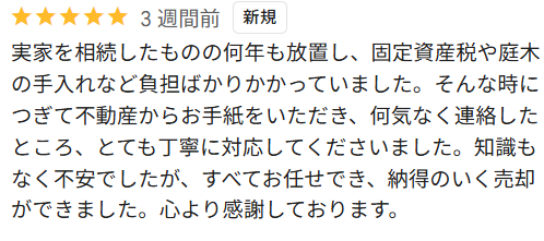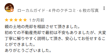 親の土地の売却を相談させて頂きました。 初めての不動産売却で最初は不安もありましたが、大変丁寧に解りやすく説明して頂き、安心してお任せすることができました。 ありがとうございました。