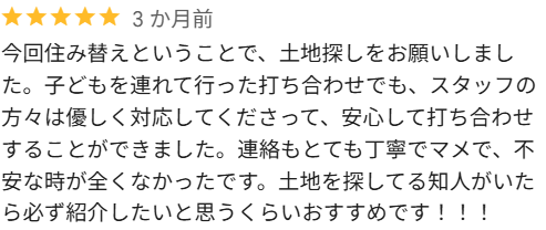 今回住み替えということで、土地探しをお願いしました。子どもを連れて行った打ち合わせでも、スタッフの方々は優しく対応してくださって、安心して打ち合わせすることができました。連絡もとても丁寧でマメで、不安な時が全くなかったです。土地を探してる知人がいたら必ず紹介したいと思うくらいおすすめです!!!